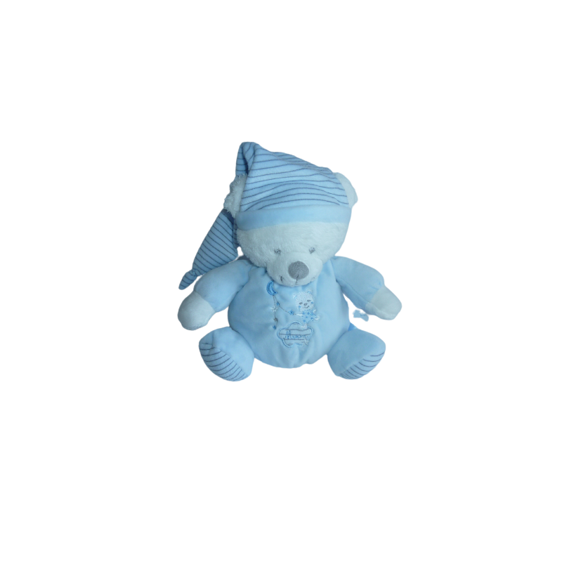 Doudou peluche ours 21 cm environ sans compter le bonnet, bleu. Etat : Neuf sans étiquette boutique. DOUDOU DIFFICILE A TROUVER.