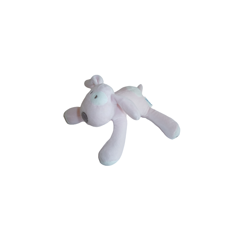 Doudou peluche chien rose blanc, 23-24 cm environ position allongée. Etat : Neuf sans étiquette boutique. DOUDOU DIFFICILE A TROUVER