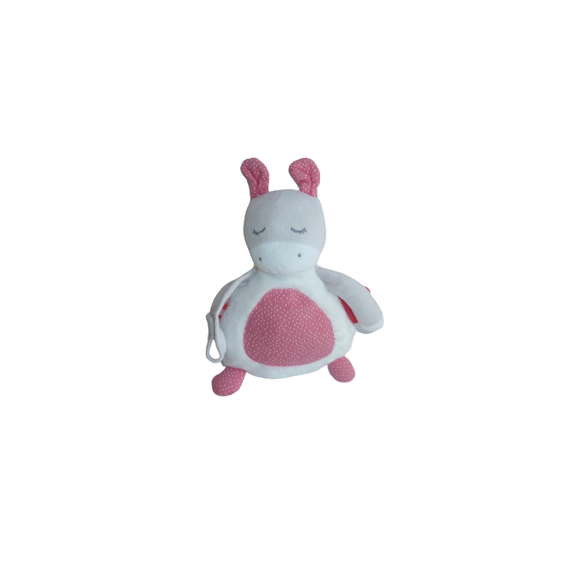 Doudou peluche cheval ou âne 26 cm environ, anneau de dentition, attache tétine par velcro, blanc rose gris. Etat : Très bon état (étiquette de la marque coupée et anneau grelot manquant). DOUDOU DIFFICILE A TROUVER