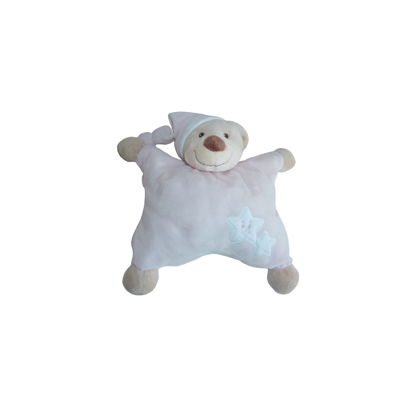 Doudou peluche ours 22 cm environ sans compter le bonnet, grelot rose motif étoiles. Etat : Neuf sans étiquette boutique. DOUDOU DIFFICILE A TROUVER