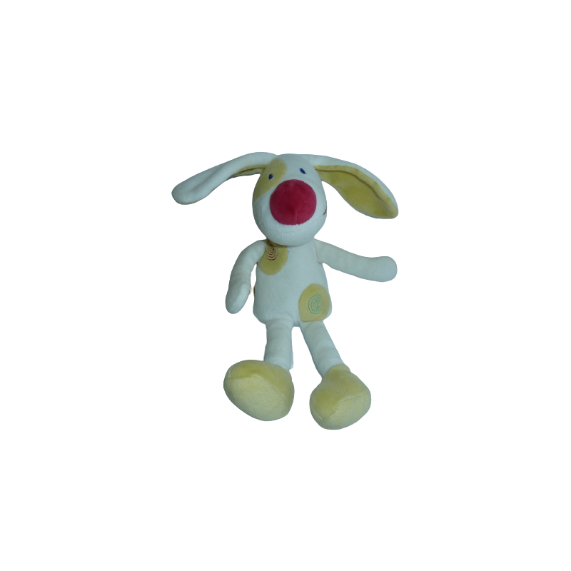Doudou peluche chien 27 cm environ, blanc, vert motif spirales. Etat : Très bon état (micro taches sur bras rien de méchant). DOUDOU DIFFICILE A TROUVER