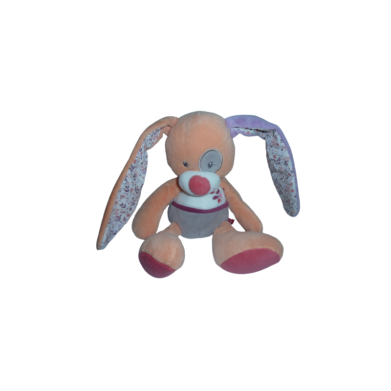 Doudou peluche lapin 24 cm environ sans les oreilles, orange rouge violet motif fleurs. Etat : Comme neuf. DOUDOU DIFFICILE A TROUVERDestinataire :