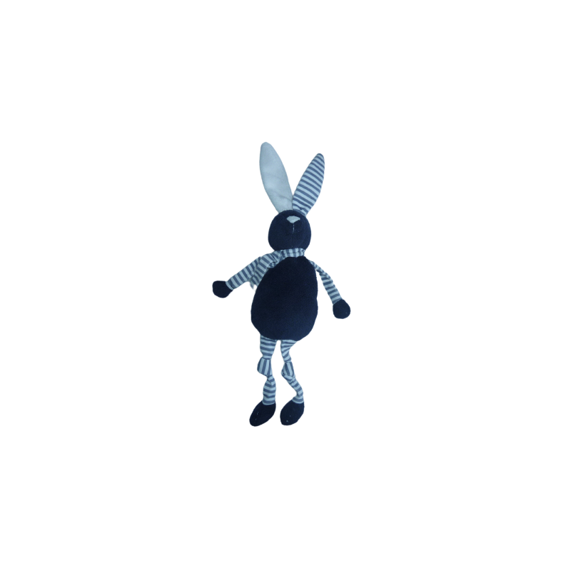 Doudou peluche lapin 31 cm environ sans les oreilles, bleu marine et rayure bleu blanc. Etat : Neuf sans étiquette boutique. DOUDOU DIFFICILE A TROUVERDestinataire :