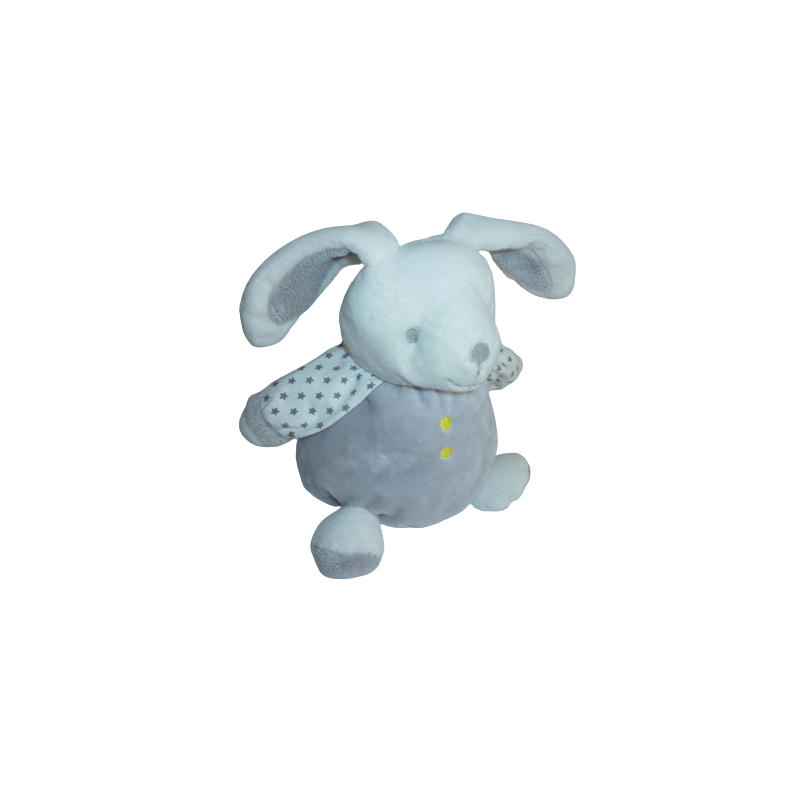 Doudou peluche lapin boule 22 cm environ sans les oreilles, grelot, gris blanc motif étoiles. Etat : Comme neuf (étiquette de la marque coupée). DOUDOU DIFFICILE A TROUVERDestinataire :