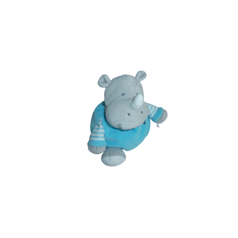 Doudou peluche rhinocéros boule 22 cm environ, grelot, turquoise gris rayures. Etat : Comme neuf (étiquette de la marque coupée). DOUDOU DIFFICILE A TROUVERDestinataire :