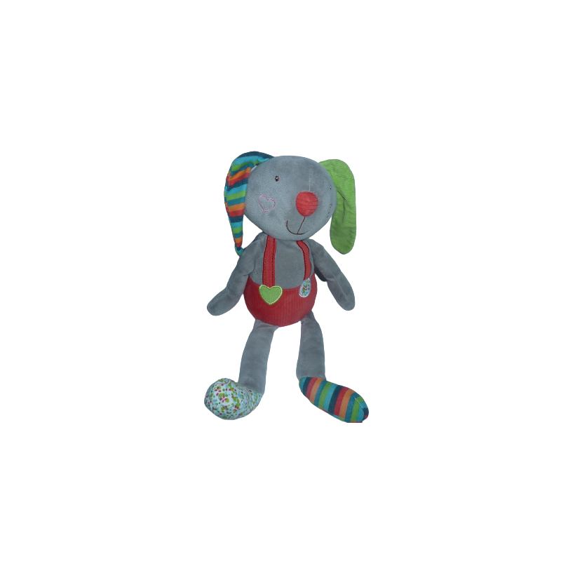 Doudou peluche lapin 39 cm environ, gris et multicolore. Etat : Très bon état. DOUDOU DIFFICILE A TROUVERDestinataire :
