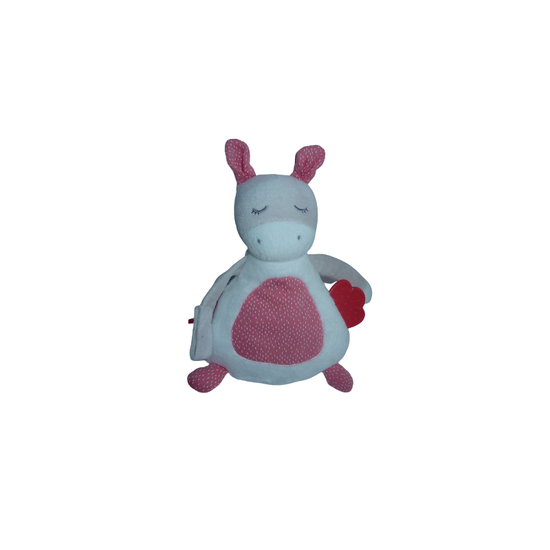 Doudou peluche cheval 26 cm environ, anneau de dentition, attache tétine par velcro, matière bruissante, blanc rose motif. Etat : très bon état mais manque l'anneau grelot