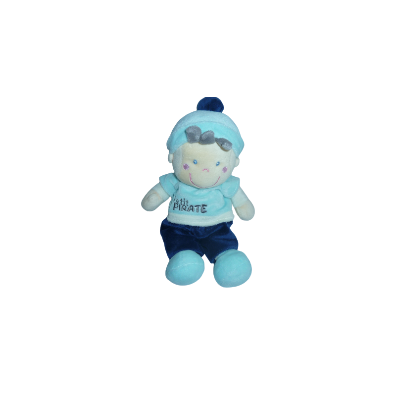 Doudou peluche poupée garçon 29 cm environ, bleu turquoise bleu marine. Etat : Comme neuf. DOUDOU DIFFICILE A TROUVERDestinataire :