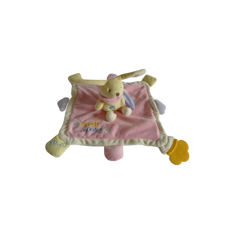 Doudou peluche mouchoir lapin : lapin 10 cm environ sans les oreilles, mouchoir : 25x25 cm environ, couleur pastel. Eveil : matière bruissante, anneau, grelot. Etat : Comme neuf. DOUDOU DIFFICILE A TROUVERDestinataire :