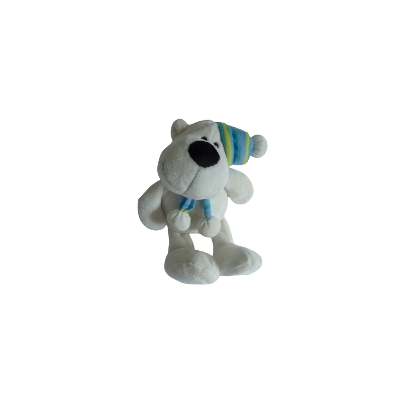 Doudou peluche ours 37 cm environ, blanc, chapeau écharpe multicolore. Etat : Comme neufDestinataire :
