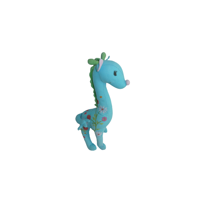 Doudou peluche girafe 37 cm environ, bleu turquoise motifs fleurs. Etat : Comme neuf (étiquette d'informations coupée)Destinataire :