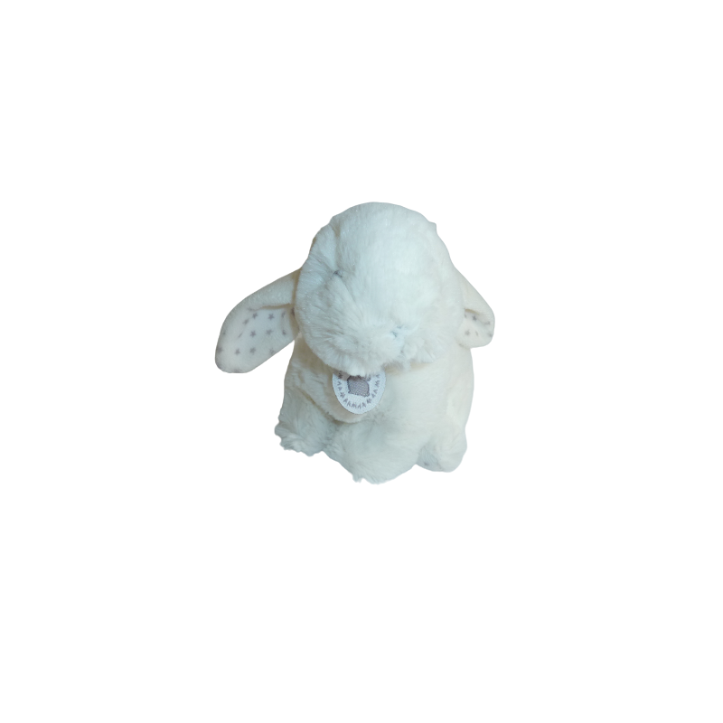 Doudou peluche lapin 16 cm environ de hauteur, billes dans le corps, écru motif étoiles. Etat : Comme neufDestinataire :