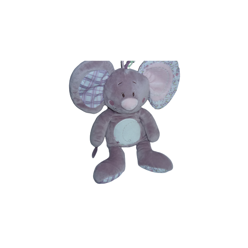 Doudou peluche souris 42 cm environ, rose blanc tissu fleuri, matière bruissante aux 2 pattes , billes au popotin. Etat : Comme neuf