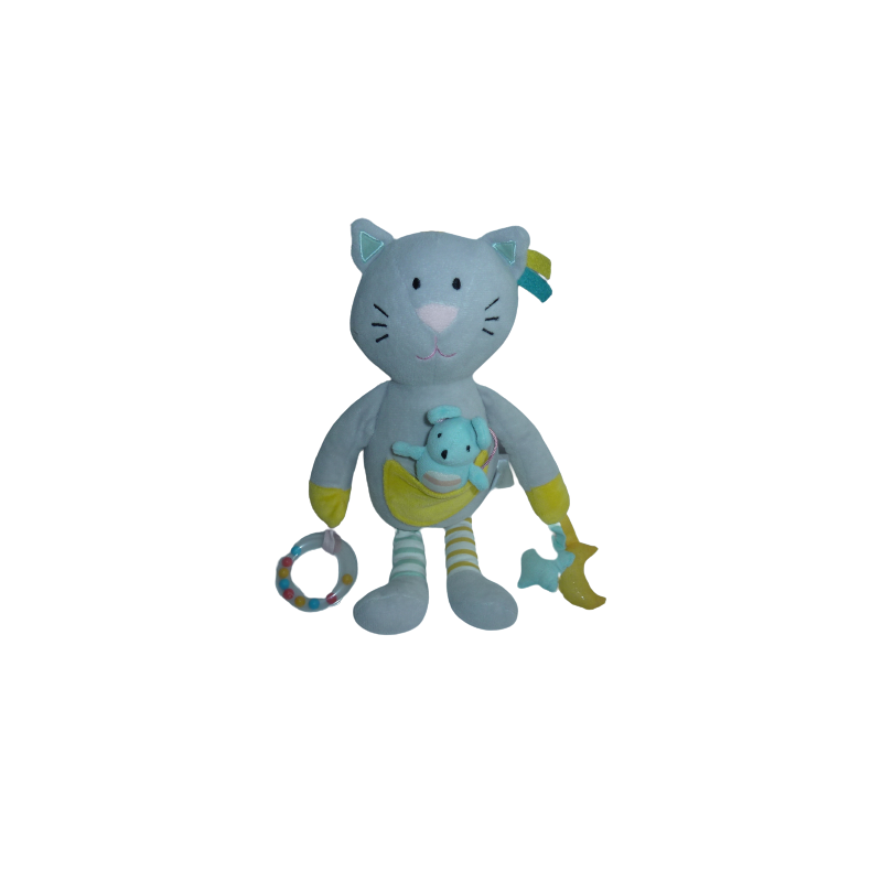 Doudou peluche éveil chat 34 cm environ, grelot matière bruissante. Etat : Parfait étatDestinataire :
