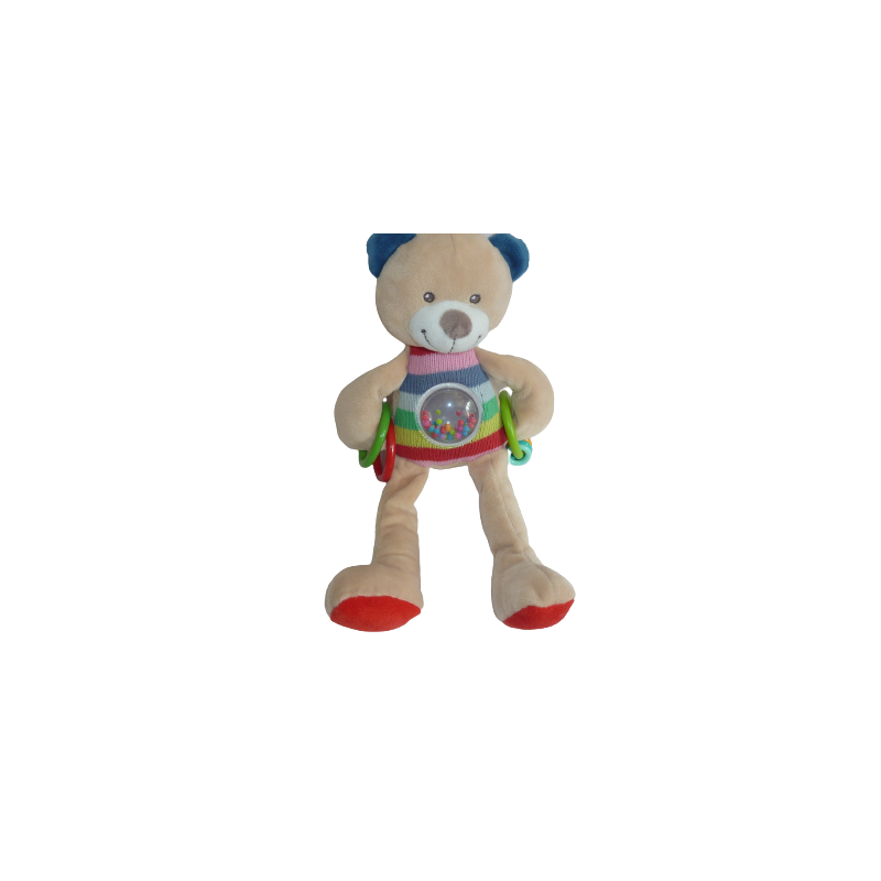 Doudou peluche ours éveil 33 cm environ, multicolore, anneaux grelots. Etat : Comme neufDestinataire :