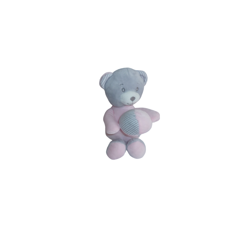 Doudou peluche ours 27 cm environ, tient un ballon, grelot, rose gris. Etat : Comme neufDestinataire :