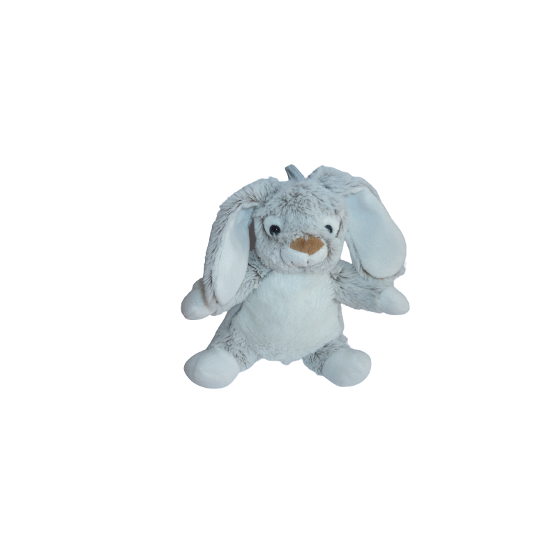 Doudou peluche lapin 23 cm environ sans compter les oreilles, billes au popotin, gris chiné blanc. Etat : Comme neuf (étiquette de la marque coupéeDestinataire :