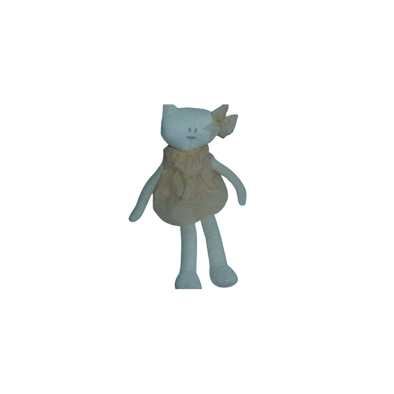 Doudou peluche chat 47 cm environ, robe satin abricot fleurs brodées. Etat : Comme neuf (étiquette de la marque coupée)Destinataire :