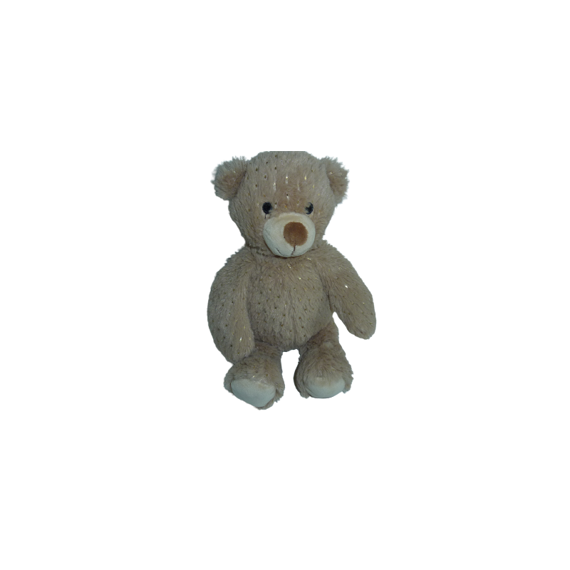 Doudou peluche ours 30 cm environ,marron mapillettes dorées. Etat : Comme neuf (étiquette de la marque coupée)Destinataire :