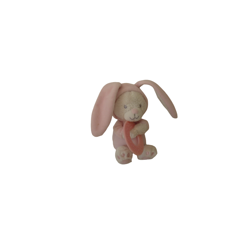 Doudou peluche ours déguisé en lapin 16 cm environ sans compter les oreilles, rose blanc motif étoiles, anneau de dentition rose. Etat : Comme neufDestinataire :