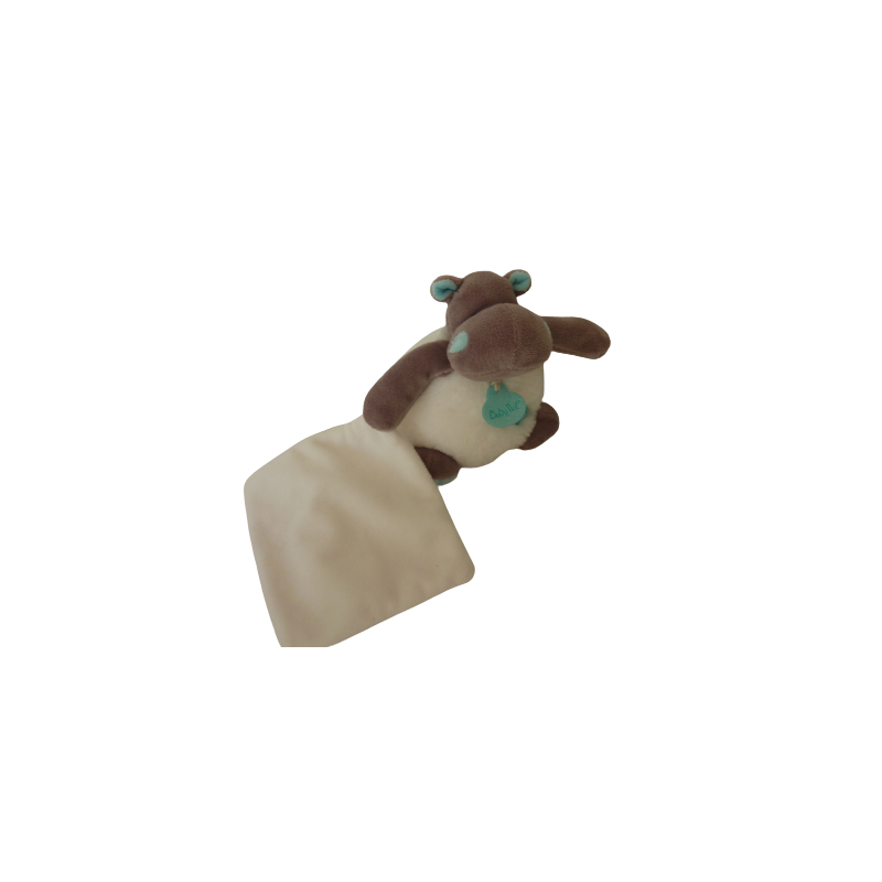 Doudou peluche hippopotame 14 cm environ, taupe blanc turquoise motif étoile, mouchoir blanc 11x11 cm envrion. Etat : Comme neuf