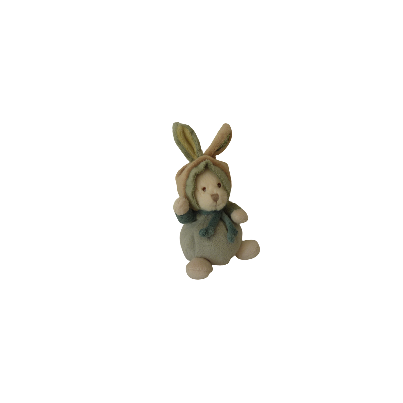 Doudou peluche ours déguisé en lapin 15 cm environ sans compter les oreilles, billes au popotin, marron vert . Etat : Comme neuf