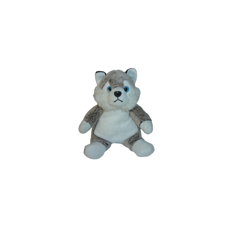 Doudou peluche chien 24 cm environ, billes au popotin, blanc gris chiné. Etat : Comme neuf