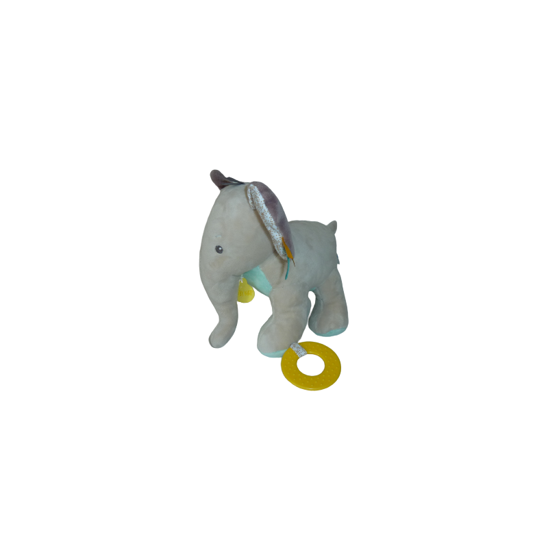 Doudou peluche éveil éléphant 21 cm environ de hauteur, matière bruissante grelot anneau dentiton, gris vert. Etat : Comme neuf