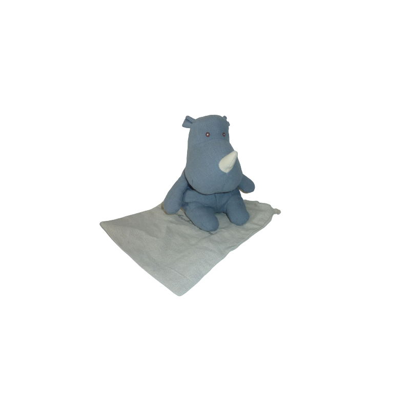 Doudou peluche rhinoécros 27 cm environ, billes dans le corps, bleu. Etat : Neuf vendu dans une très joli pochette en tissu