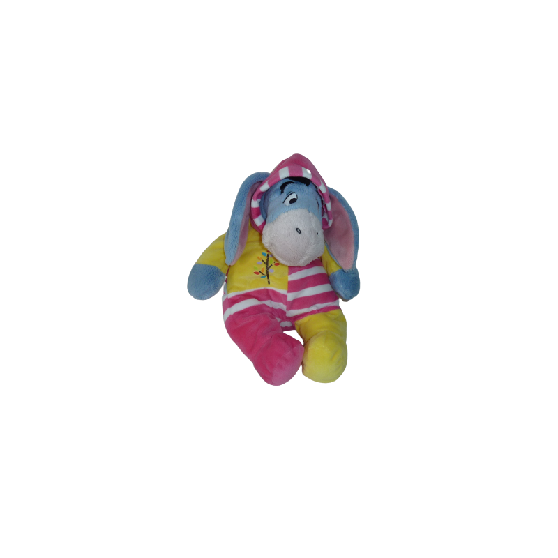 Doudou peluche Bourriquet 32 cm environ, pyjama jaune rayure rose blanc. Etat : Très bon état