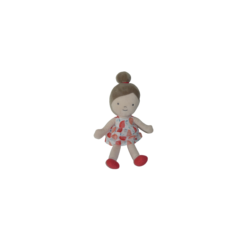 Doudou peluche poupée 35 cm environ, robe fond blanc à motif rouge. Etat : Comme neuf