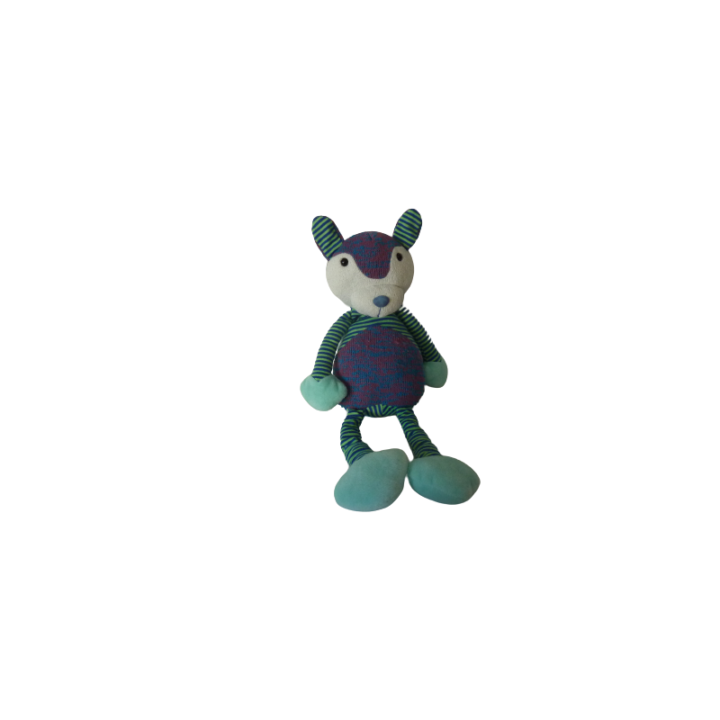 Doudou peluche chien renard 43 cm environ tout compris, billes au popotin, rayures bleu vert. Etat : Excellent état (juste matière sur le nez partie)