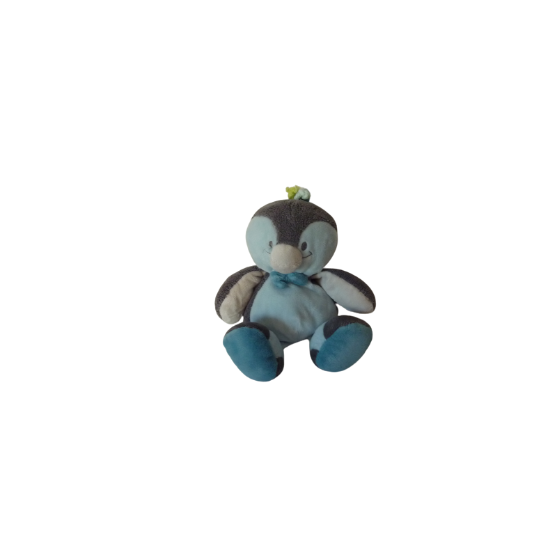 Doudou peluche pingouin 29 cm environ, billes au popotin, gris turquoise. Etat : Comme neuf