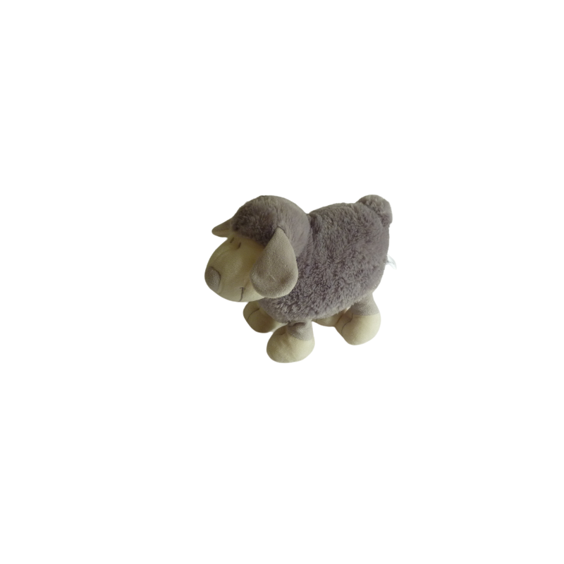 Doudou peluche mouton 22 cm environ de hauteur et 27 cm environ de large, gris écru, billes dans les pattes. Etat : Comme neuf