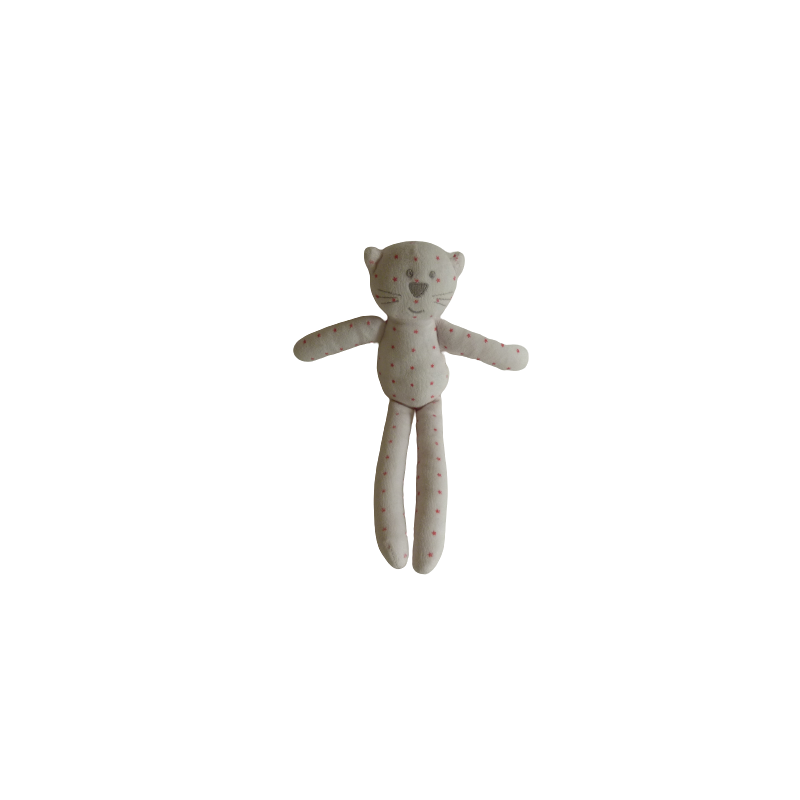 Doudou peluche ours ou chat 30 cm environ, rose très pâle motif étoiles. Etat : Très bon état (étiquette de la marque coupée)