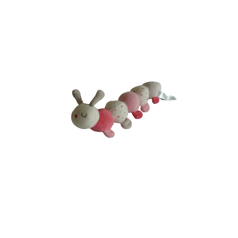 Doudou peluche mille pattes chenille 31 cm environ de longueur, grelot, matière bruissante, dégradé de rose blanc motifs pois. Etat : Comme neuf