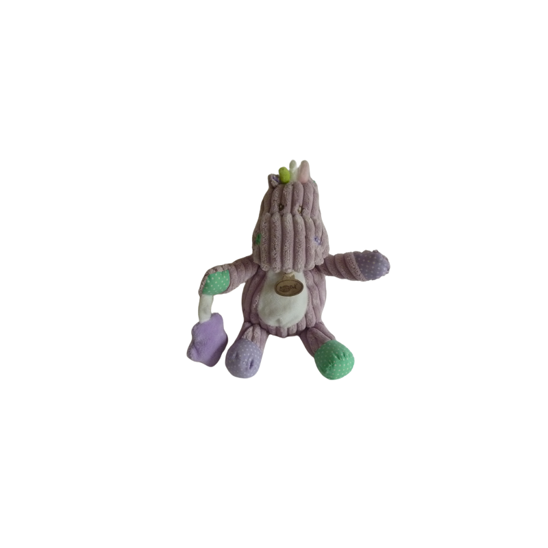 Doudou peluche hippopotame 26 cm environ, grelot, matière bruissante aux pattes, blanc parme. Etat : Excellent état