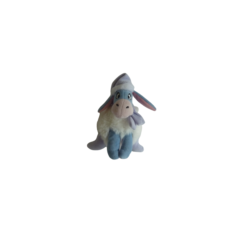 Doudou peluche Bourriquet 18 cm environ, bleu blanc parme. Etat : Comme neufDestinataire :