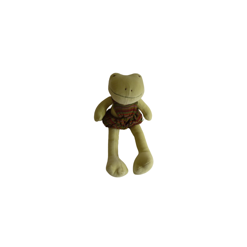 Doudou peluche grenouille 31 cm environ, vert, salopette multicolore. Etat : Excellent état