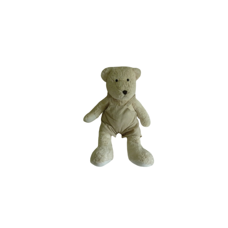 Doudou peluche ours 39 cm environ écru blanc salopette beige. Etat : Comme neufDestinataire :