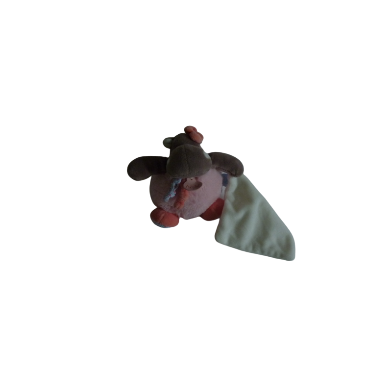 Doudou peluche hippoptame 13 cm environ rose orange, mouchoir blanc 11x11 cm environ. Etat : Comme neuf