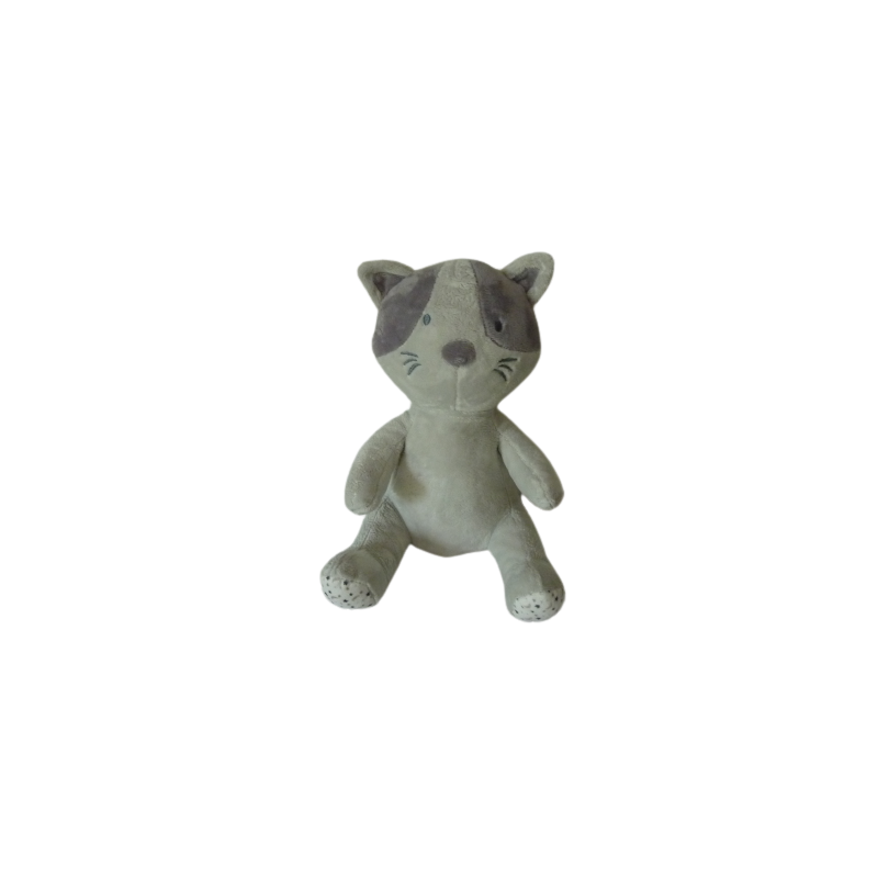 Doudou peluche chat 27 cm environ, gris, motifs étoiles lune sous les pattes. Etat : Comme neuf
