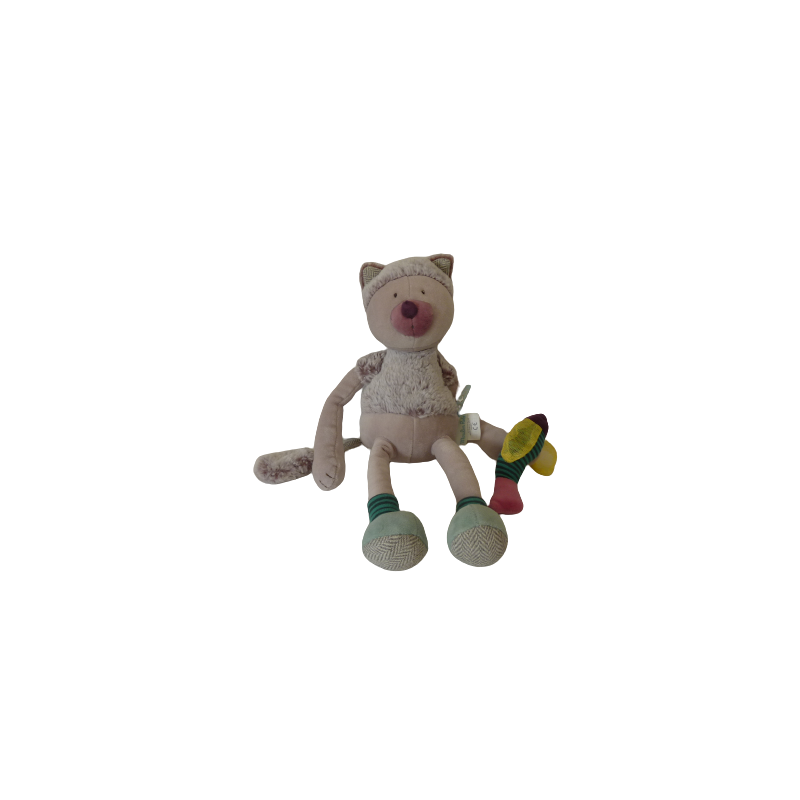 Doudou peluche chat 38 cm environ, billes au popotin et pattes, multicolore. Etat : Comme neuf