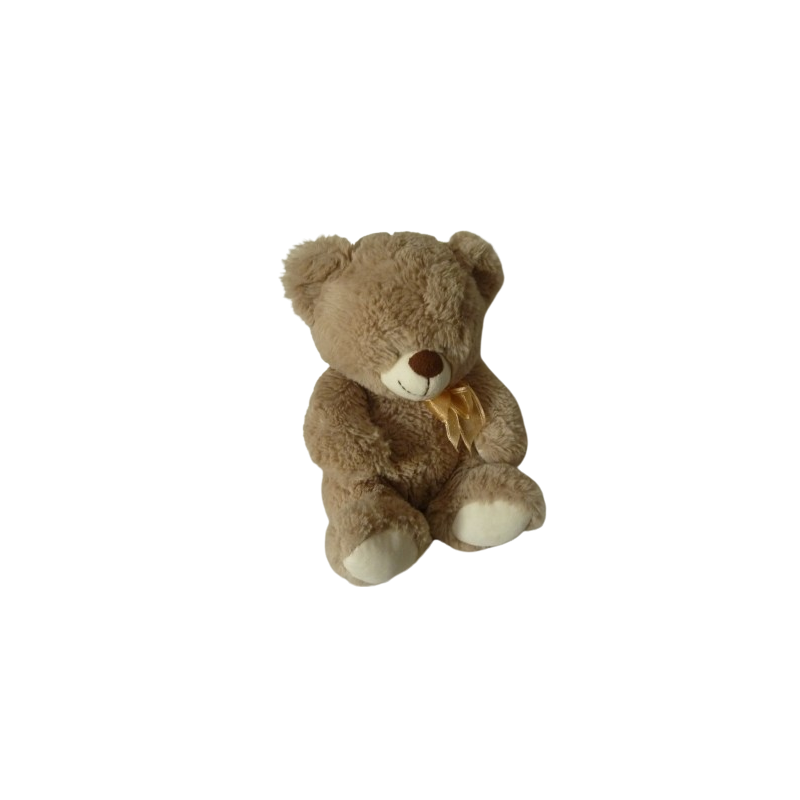 Doudou peluche ours position assise 30 cm environ, marron écru nœud doré. Etat : Comme neuf