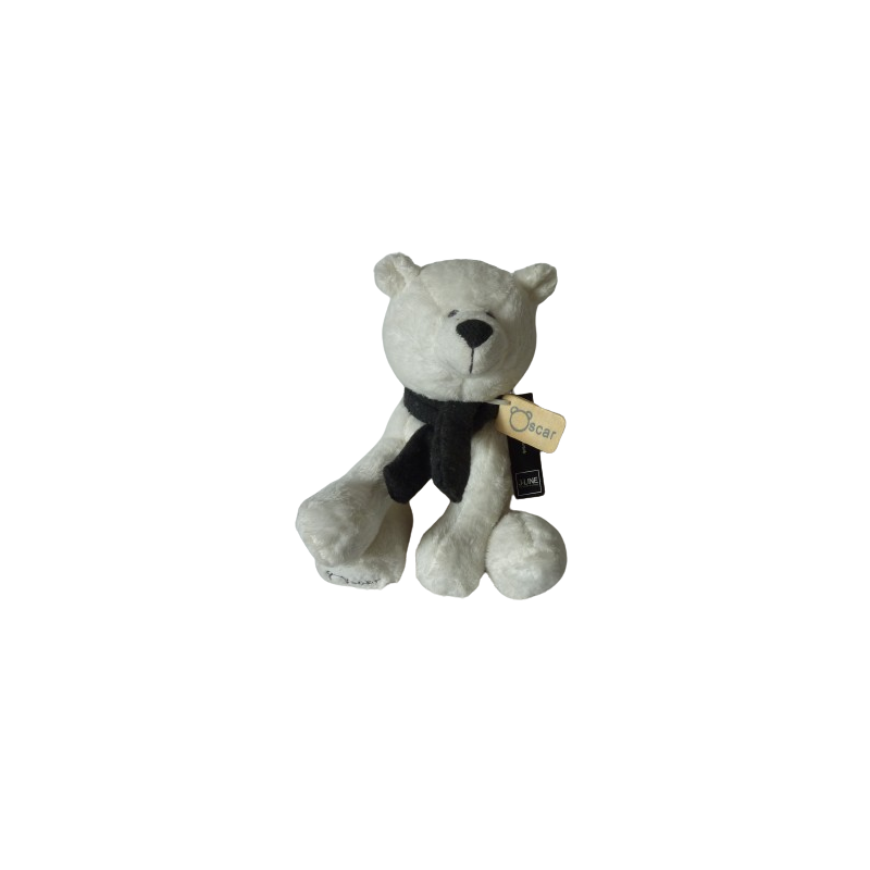 Doudou peluche ours en position assise 21 cm environ de hauteur, blanc écharpe gris anthacite. Etat : NeufDestinataire :