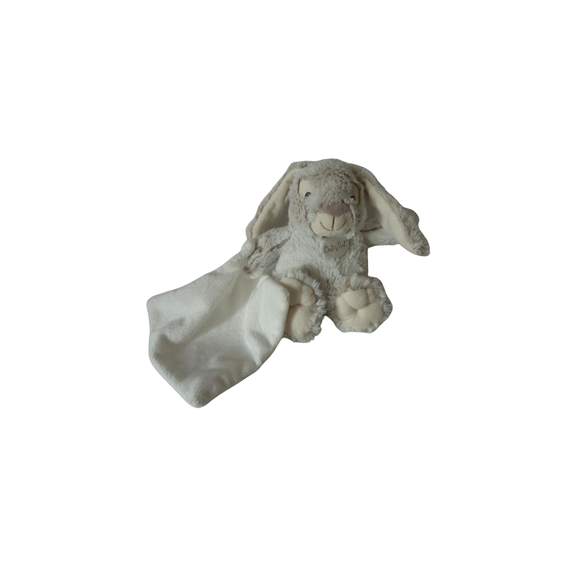 Doudou peluche lapin 25 cm environ marron beige chiné, mouchoir blanc 16x16 cm environ. Etat : Comme neuf