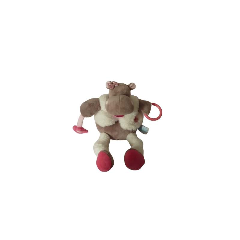 Doudou peluche éveil hippopotame 28 cm environ, grelot anneau matière bruissante pouet pouet, marron blanc rose motif fleur. Etat : Comme neuf