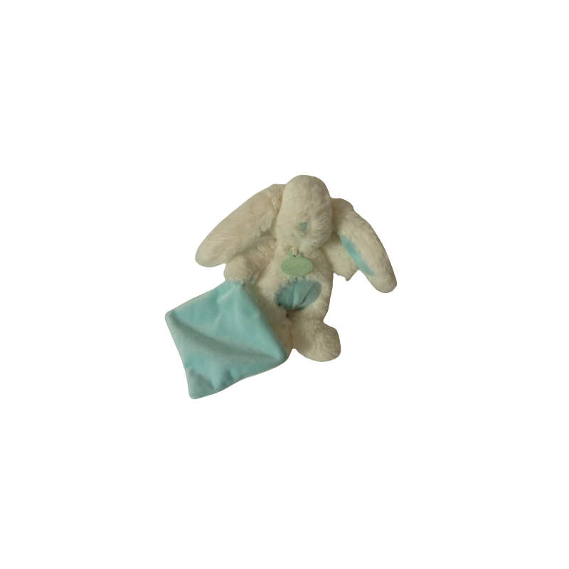 Doudou peluche lapin 21 cm environ sans compter les oreilles blanc turquoise, mouchoir turquoise 9x9 cm environ. Etat : Comme neuf (étiquette marque coupée)