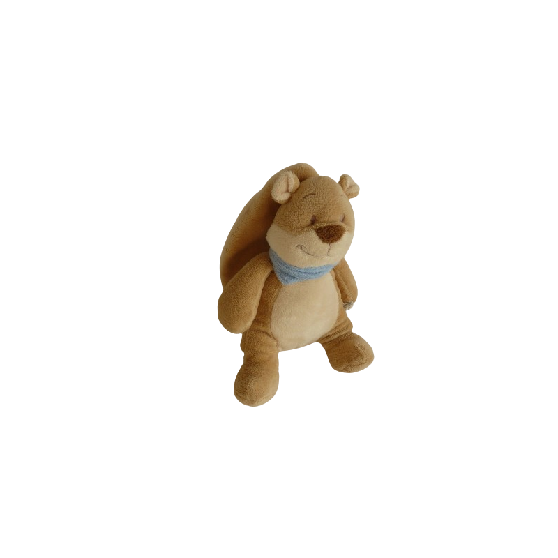 Doudou peluche écureuil 23 cm environ, marron beige écharpe bleu, queue attaché par velcro. Etat : Comme neufDestinataire :