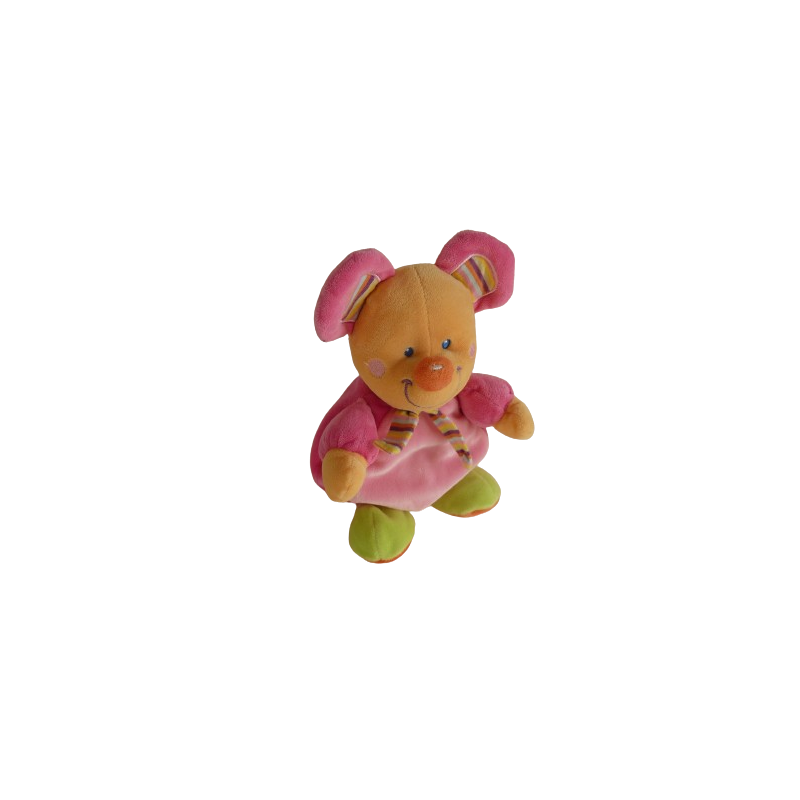 Doudou peluche souris 26 cm environ oreilles comprises, rose vert orange. Etat : Parfait état